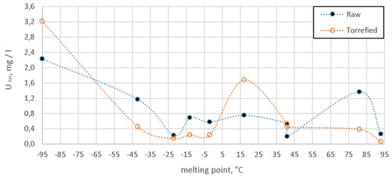 In terms of the torrefaction, some counterintuitive results have been obtained. Typically, torrefaction leads to the increase in the heating value of the processed biomass [15,16,17,68,69,70]. In the case of this study, both HHV and LHV decreased as a consequence of the performed treatment (Table 1). Moreover, the carbon content decreased after the torrefaction. In general, it seems plausible to justify this by a couple of factors, such as the severity of the process (temperature), torrefaction in the oxidizing atmosphere (see Figure 5), as well as the autocatalytic effect of the inorganic fraction of the material. It is clear from Table 1 that ash content increased significantly during torrefaction. Moreover, the initial ash content of the sewage sludge, prior to torrefaction, was high.
