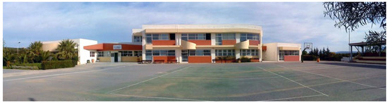 The high-school building under consideration (Figure 2) is located in the small town of Arkalochori, in the hinterland of the island of Crete, 25 km to the south from the city of Heraklion, the capital of the island. The geographical coordinates of the building are 35°09′20′′ N, 25°16′08′′ E. The energy upgrade of the school building from energy performance rank D to B+ was funded by a national—European Union (E.U.) co-funding action, following an open tender posted by the responsible Ministry of Energy in 2011.
