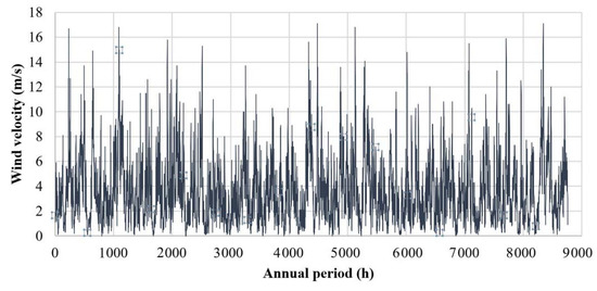 In Figure 4 the annual time series of the wind velocity is presented, as measured by the same meteorological station. The annual average wind velocity is measured at 3.58 m/s, while the Weibull parameters are calculated at C = 3.99 m/s and k = 1.42. The above features indicate the existence of relatively mild wind conditions in the examined location. This annual wind velocity time series will be employed in this work for the calculation of: