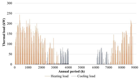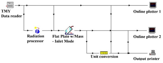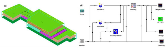 The calculation of the heating and cooling loads is based on the essential relevant methodology [41] and was executed with TRNSYS. The building’s simulation model and the logical diagram introduced in the software application are presented in Figure 6.