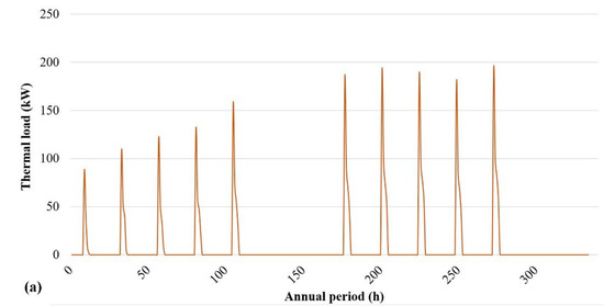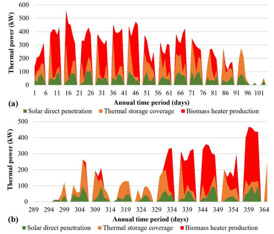 - While approaching the last days of March or during the last days of October, the thermal power direct penetration of the solar collectors and the contribution of the thermal storage tanks undertakes all the heating loads. The biomass heater contribution during these periods is negligible.