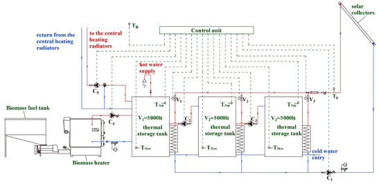The above tasks are executed with the support of the TRNSYS software application, regarding the heating loads calculation and the simulation of the solar collectors’ performance. The combined operation of the solar collectors, the thermal storage tanks and the biomass heater is executed with simulation applications of the introduced operation algorithm, developed by the authors on the LabVIEW platform. The calculation is executed on hourly average calculation steps and for one whole annual period.
