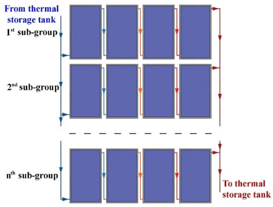 Finally, a very recent innovation concerning the exploitation of solar radiation are the photovoltaic thermal hybrid solar collectors. These devices exploit solar radiation for both electricity production, acting as a common photovoltaic panel, and for thermal energy production, acting as a flat plate solar collector, cooling, concurrently, through the flow of the working medium in the pipelines, the photovoltaic panel and improving, in this way, its efficiency [18,19,20]. The total efficiency for both thermal energy and electricity production is increased above 85%, calculated as the ratio of the total electrical and thermal power output versus the incident solar radiation on the total photovoltaic hybrid collector’s effective surface.
