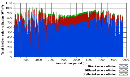The incident solar radiation on the horizontal surface is presented in Figure 3, measured by a local meteorological station installed by the Hellenic National Meteorological Service (HNMS) [40], in a location roughly 15 km away from the building’ location (coordinates 35°12′30′′ N, 25°20′20′′ E). In Figure 3 is shown that the solar radiation can exceed 900 W/m2 during summer, with a yearly global irradiation at 1857 kWh/m2. During winter it normally reaches values above 500 W/m2.