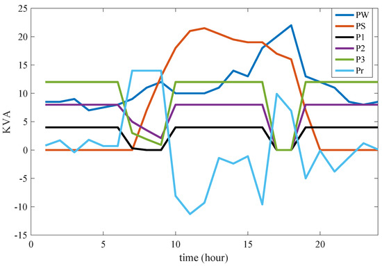 The values for and were estimated based on the wind speed readings with an anemometer installed at a height of 8 m, as well as the stochastic and diffuse global irradiance detected per hour using the simplified inclined plane model at the location in 20°8′3.63″ N, 98°23′4.57″ W at 2181 m altitude above sea level. Table 3 shows the values of input data for each of the 24 periods t in the one-day analysis period, the energy that can be produced by wind origin , that of the photovoltaic plant , the demand total that must be met , the factors of interruptibility for each client in the EDR program and finally the environmental contingency factor that defines the start or stop of the pollution regeneration system of the machines of the conventional generators. On the other hand, the paper considers the weighting of conventional generation costs and interconnection (w) with a value of 0.5, the cost is United States Dollar ($ USD) of kVA/h transferred with the main grid is asymmetric in such a way that the sale is $ 1 and the purchase costs is $ 2.8. The maximum capacities of the generating plants are 25 kVA, 22 kVA and the conditions of contract and installation only allow the maximum transfer of energy with the upper mesh of 14 kVA and the maximum budget bonus in EDR is $ 400.