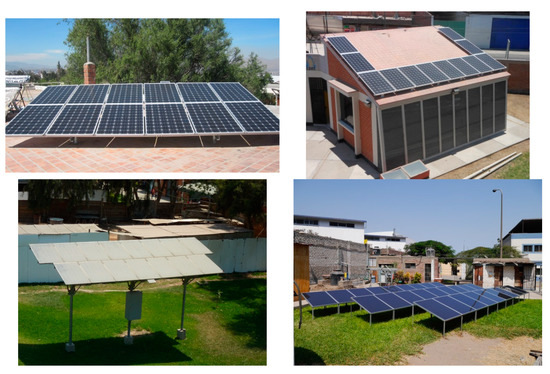 All the PV fields described in the preceding paragraph are equator-facing with a tilt angle of 15°. Note that the inverter sizing factor—ratio of rated inverter output power to PV field power at STC [32,33]—used in the design of the systems above ranges from 0.87 (Lima, a-Si/µc-Si) to 1 (Lima, mc-Si) through 0.91 (Arequipa and Tacna, sc-Si). Moreover, the nameplate rating of the PV modules was used in every calculation. The characteristics of each PV field are gathered in Table 2. Figure 1 shows photographs of all the PV systems under scrutiny in this paper.