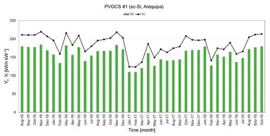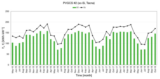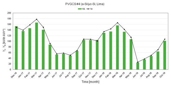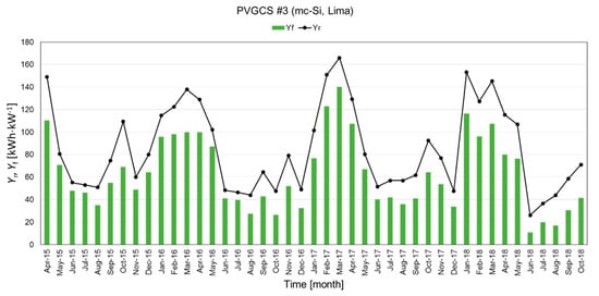 Arequipa shows the relatively most stable monthly irradiation profile, staying between 150 and 200 kWh·kW−1 for the most part of the experimental campaign. Seasonality was more pronounced in Tacna, as values of Yr were higher in December–March and lower in May–July. Specifically, the seasonal spread that this parameter experiences—the difference between its maximum and minimum value—is around 100 kWh·kW−1. It is clear that Lima has the lowest irradiation profile, resulting in far smaller monthly yields than those achieved in Arequipa and Tacna. Lima also shows the most remarkable seasonal trend of the solar resource over the period under investigation. Thus, as shown in Figure 4, Yr stays below 60 kWh·kW−1 during winter months—lowering to 30 kWh·kW−1 in June 2018—while this parameter peaks at values above 160 kWh·kW−1 in March. It should be remarked that Yf for PVGCS #3—mc-Si, left unclean—is lower than YA for PVGCS #4—a-Si/µc-Si, weekly cleaned PV subfield. Of course, both yields cannot be directly compared, as balance-of-system losses were not subtracted from YA. However, these noticeable differences between the yields of both systems located in Lima will be dealt with in-depth in the subsequent analysis regarding performance.