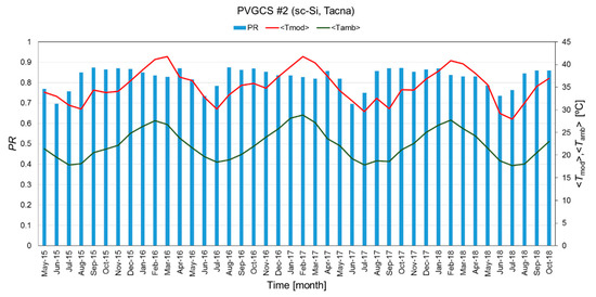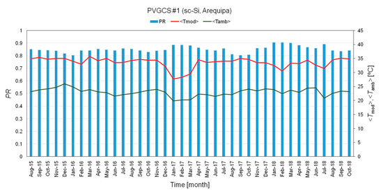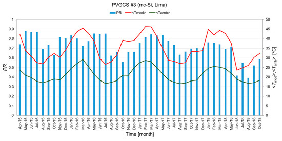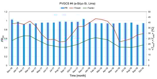 Figure 6, Figure 7 and Figure 8 show the values of PR for PVGCS #1–#3, while Figure 9 depicts the values of PRDC for PVGCS #4. All these values are plotted over the period under study of each system. In order to gain a better interpretation of the behavior of the four cases of study, ambient and module temperatures averaged on a monthly basis during daytime (<Tamb>, in °C and <Tmod>, in °C, respectively) are also shown in these Figures. The latter parameters are obviously correlated and help analyze the detrimental impact of the module temperature increase on PV performance.