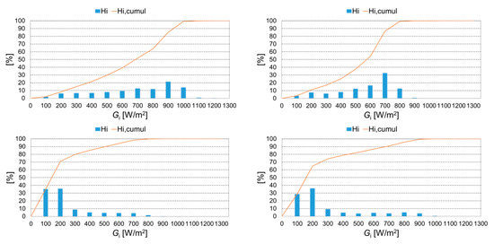 PVGCS #3 exhibits a remarkable seasonality, mainly caused by the influence of two factors described as follows. Higher module temperatures lower PR, thus decreasing it to 0.69 in April 2018. Conversely, PR lies within 0.87–0.88 in May–July 2016, when temperatures were colder. On the other hand, most in-plane irradiation was collected in Lima at low levels of in-plane irradiance (<200 W·m−2) in August-October, which is conducive to a remarkable decrease of PV efficiency. To achieve a better understanding of this phenomenon, a specific month of the latter interval was studied. Thus, the percent and accumulated percent of Hi in different ranges of Gi during August 2017 for PVGCS #3—whose PVRD was left unclean—and PVGCS #4—whose PVRD was cleaned on a weekly basis—are shown in Figure 11. Clearly, the distribution of Hi is remarkably enhanced at lower Gi classes, regardless of whether the in-plane irradiation comes from a weekly cleaned PVRD or a PVRD left unclean. As shown below, this leads to a poor performance of mc-Si PV modules, due to the losses this PV material exhibits at low irradiance levels. Specifically, for the month under scrutiny, as much as 65% of the in-plane irradiation was collected below 200 W·m−2, as measured with the weekly cleaned PVRD. This percentage rises up to over 70% when measured with the PVRD left unclean. By contrast, the portion of Hi collected below 200 W·m−2 shrinks to only some 10% in some warmer months, such as March 2016, as shown in Figure 11.