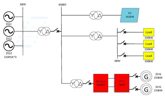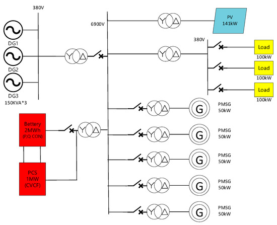 In this case, it is necessary to establish conditions that can supply electric power to the power system stably even in the case of dropout of diesel generator and emergency situation. Figure 3 shows a schematic of the existing Marado Island power grid. Currently, most diesel generators in the power system of this island have power supply, which can lead to a serious situation in which the entire power system is dropped when a fault occurs. Although a battery system is installed, it is currently not operating because of surplus power management and operational problems.