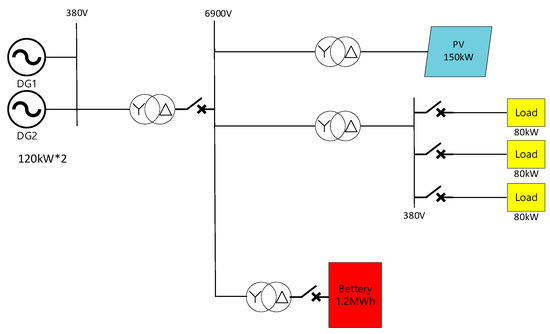 Marado Island is located about 5.5 km south of Gapado Island. Two power plants with 150 kW capacity are used as the main power source as shown in Figure 3. There are two battery systems with a capacity of 600 kWh, and two solar power plants with a capacity of 75 kW for solar power output fluctuation mitigation and emergency power reserve. The maximum load power consumption is about 240 kW [7]. There are three major power loads on this island. The first is the main moving method, the electric cart, so charging electric power here is the biggest power load. Here, the consumption time of the electric power load is from evening to morning. The second is the electric power load on the catering business for tourists, which is the power load mainly consumed during the daytime when tourists stay. The third is the power load that is constantly consumed throughout the day as the normal home electric load. As a result, the power load pattern of Marado Island is constantly consumed.