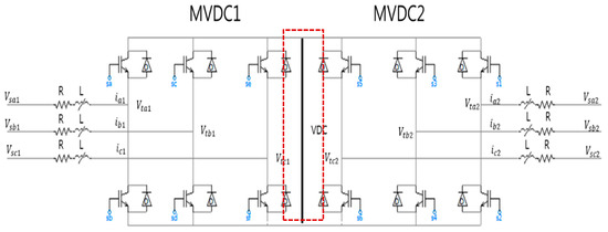 where j is expressed as a three-phase component of voltage and current, and is j = a, b, c. K is MVDC1 and MVDC2 in Figure 5, and k = 1, 2; , and are the 3-phase voltage and current of MVDC-k.; and R and L are the resistance and inductance of the system. Using Park’s transformation, the AC voltage can be used as a dq-frame, as shown in Equations (2) and (3):