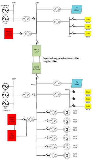 This has the same structure as the current power grid, because it aimeds to maintain the existing power system as much as possible and to operate it optimally. In addition, the already installed 150 kW photovoltaic system is operated irrespective of the power system situation. In this case, when the generated power is surplus or insufficient, the power system is maintained by supplying or receiving the power with the MVDC. Section 3.2.3 shows the related simulation results.