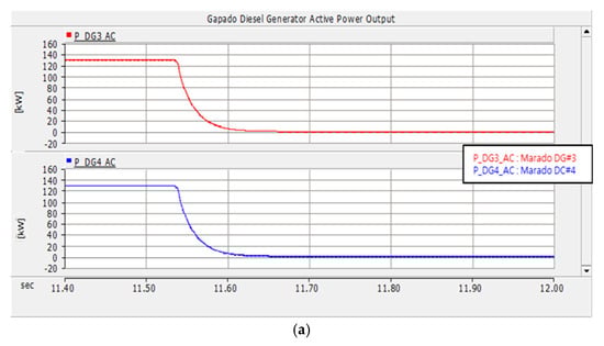 Figure 12a, shows that the active power of the two diesel generators is 150 kW each. This is because the active power of the diesel generator is controlled in 1 MW PCS with a 2 MWh battery. When two diesel generators are dropped out, the diesel generator # 5 and the 1 MW PCS with a 2 MWh battery are operated, and the system is switched to the emergency mode and operated by CVCF, which controls the voltage and frequency of the power system (Figure 12b). As a result, the voltage and frequency of the power grid drop to 4 kV and 57 Hz, respectively. But it can be confirmed that the power system is restored to its normal state quickly without collapsing.