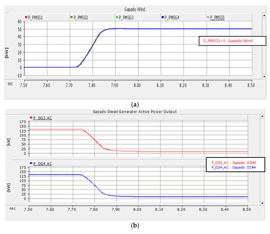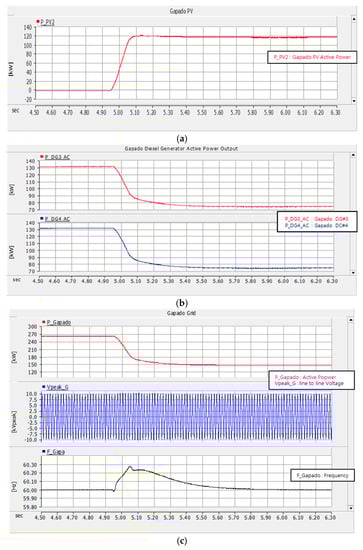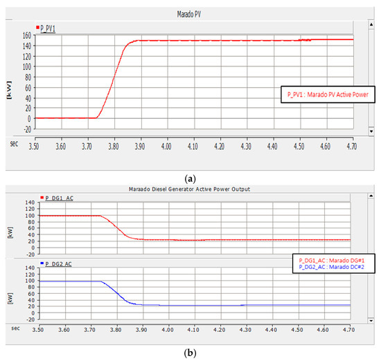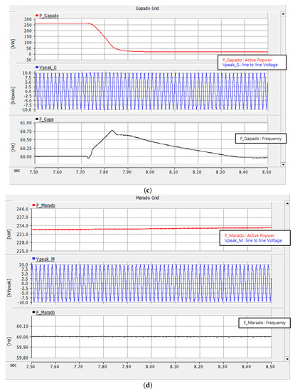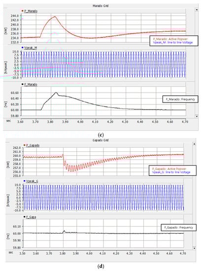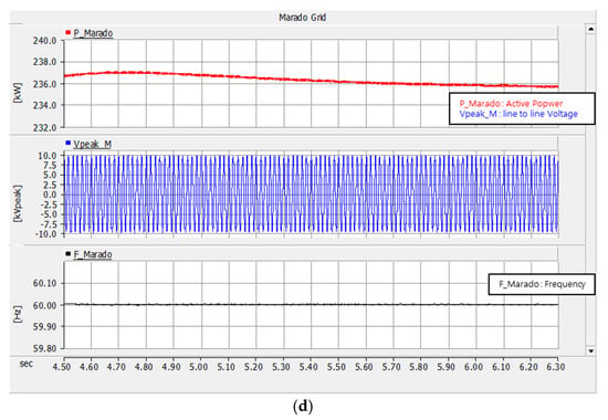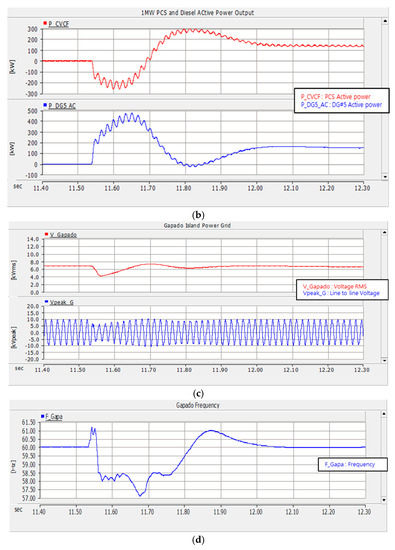 Figure 13 shows the output characteristics of the Marado grid and diesel generator according to the 150 kW PV output. Figure 13a shows that the 150 kW PV installed on Marado Island is supplying the maximum power to the power grid. Figure 13b shows that the output of the two diesel generators operated at this time decreases the output of the diesel generator as much as the PV penetration. Figure 13c shows the state of active power, voltage, and frequency in the power grid of Marado Island. It can be seen that the frequency of the power grid temporarily rises to 60.6 Hz instantaneously at the moment of PV penetration, but returns to steady state quickly. Figure 13d shows that the maximum power of the PV and operating on Marado Island does not affect the power grid of Gapado Island.