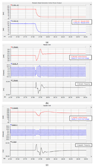 Figure 16a shows a waveform in which two diesel generators suddenly dropout when a diesel generator in Marado Island is supplying power to the power grid. At this time, the MVDC changes from normal mode to emergency mode, confirming that the active power, voltage, and frequency (59~61 Hz) of the power grid are quickly returned to the normal state (Figure 16b). Figure 16c shows the state of the active power, voltage, and frequency of the grid on Gapado Island due to diesel generator shutdown on Marado Island. At this time, the MVDC is switched from normal mode to emergency mode. It can be seen that voltage and frequency fluctuations have occurred but return to normal steady state. Figure 16c also shows that there is no change in the power system of Gapado Island due to the diesel generator shutdown on Marado Island [16].