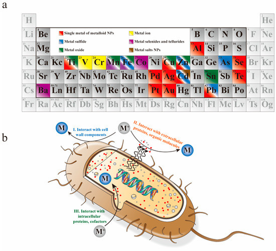 (a) Periodic table of elements that have been synthesized by bacteria. (b) Schematic representation of bacteria synthesis of NPs; both intracellular and extracellular process are included.