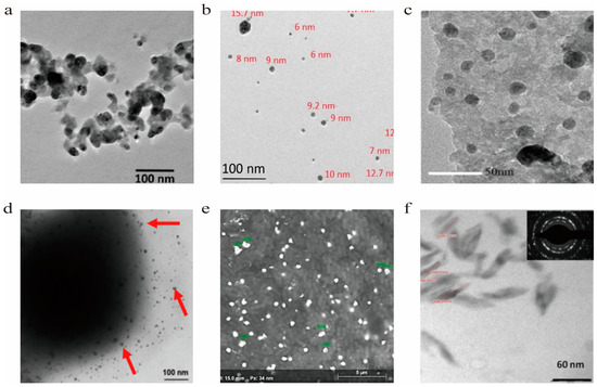 In the bioreduction process, some enzymes play an important role in transporting electrons from certain donors to positive metal ion [35,36]. These enzymes are also considered to be responsible for the stabilization of the resultant NPs [37]. Ghiuta et al. employed two Bacillus species, namely, Bacillus amyloliquefaciens and Bacillus subtillis, to synthesize Ag-NPs. The well-defined Ag-NPs were distributed within quite a narrow size range in both cases. The authors believed that the alpha-amylase enzyme could control the size of Ag-NPs in a narrow range, and it is well known that both of these bacteria can generate the alpha-amylase enzyme [38,39]. Mishra et al. found that the Stenotrophomonas sp. BHU-S7, which was previously known as Pseudomonas maltophilia, could biosynthesize spherical Ag-NPs extracellularly. As shown in Figure 2a, the average size of these NPs is approximately 12 nm. The most widely accepted mechanism is that the extracellular enzymes, such as nitrate reductase enzyme, that appear in the supernatant facilitate electron transfer to Ag+ ions, resulting in the formation of Ag-NPs. They also proposed that the carbonyl groups of some proteins and enzymes could stabilize the Ag-NPs by binding to the NP surfaces [40].