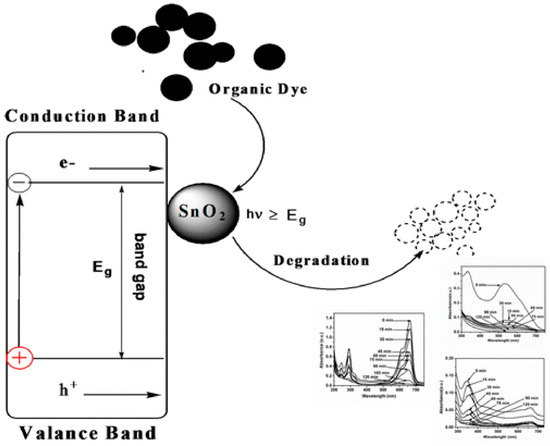 Schematic representation of the photocatalytic degradation process of dyes using SnO2 nanoparticles (reprint from [70] with permission from the American Chemical Society. Copyright 2014).