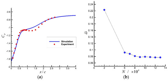 Large eddy simulation (LES) is used to analyze the separation phenomenon in consideration of the influence of small vortices added by Smagorinsky–Lilly sub-grid model. And ANSYS Fluent software is used for the numerical simulation. To validate the numerical method, we compare the numerical and experimental results of the static pressure coefficient on the suction surface of the curved diffuser without any flow control (shown in Figure 2a where c is the chord length of the blade). The numerical result basically agrees with that of the experiment. The grid-independent study is performed as shown in Figure 2b. When the grid number is higher than 9 × 104, the total pressure loss is nearly invariant, and the simulated performance is independent of the grid. Considering both computational accuracy and economy, the grid number used is about 1 × 105. The mesh grids (illustrated in Figure 1b) near walls and leading and trailing edges are densified to satisfy the demand of LES that near walls. Clearly speaking, the near-wall grid scale is set as 0.01 mm, and it is about 25 times the Kolmogorov scale length (the Kolmogorov scale length ). In addition, a combination of structural and unstructured meshes is used to guarantee grid quality in the diffuser and traveling wave regions. Boundary conditions of the inlet and outlet are set to make the inlet Mach number approximately 0.1 (the Reynolds number defined by the length of blade chord is 1.81 × 105), whereas the surface between traveling wave wall and main flow in the diffuser is treated as rotor–stator interface. Dual-time stepping is used to solve the unsteady process with the physical time step of 10−5 s. For traveling wave wall, we are concerned with the fully-developed state (rather than the transient state) when the traveling wave fully interacts with the unsteady flow field and the influence of the initial field is negligible. So, when the outlet mass flow rate is quasi-periodic, the flow field is considered to be fully-developed, and only a period (104 physical time steps) of fully-developed unsteady flow field is analyzed.