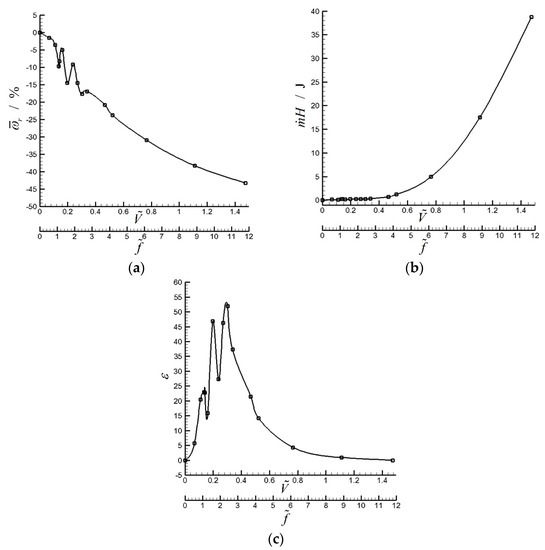 Simulation results: (a) relative total pressure loss coefficient versus dimensionless phase velocity or frequency ; (b) energy consumed by the traveling wave wall versus dimensionless phase velocity or frequency ; (c) energy efficiency versus dimensionless phase velocity or frequency .