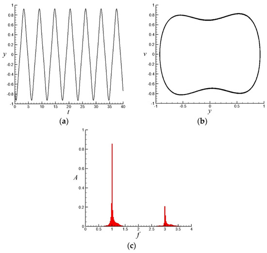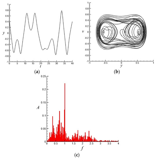Time–displacement and velocity–displacement phase diagrams are shown in Figure 6a,b when the reduced frequency is valid, where is 1. From the analysis of these figures, the mechanism of good control effect when dimensionless frequency equals some unique frequencies can be determined. With valid external periodic excitation, the motion of fluid element is entirely orderly and periodic. This result is also reflected by MLE (−0.05). FFT of displacement with valid excitation is shown in Figure 6c. Compared with those in Figure 4c, valid excitation eliminates many clutters and the frequency spectrum is only dominated by the main system frequency and three times of it (due to the cubic nonlinear term).