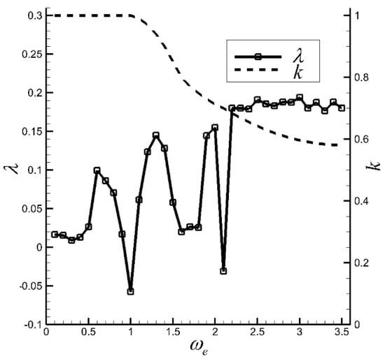 When is small, the traveling wave wall cannot change the natural frequency of the flow field ( is also small). Thus, equals 1 when is small. However, a very large serves as a smooth cylinder felt by the flow field and will also barely affect the natural frequency. As a result, . In the simplified model, is first given, as shown in Figure 5, to determine if it can generate similar results to those in Figure 3, and in Equation (14). The MLE is then calculated with increased dimensionless frequency , which is also shown in Figure 3. The trend of MLE is similar to that in Figure 3. Specifically, when the values of are around 1, 1.6, and 2.1, MLE considerably decreases and even tends to below zero. Low MLE indicates that the fluctuation characteristics of the fluid element will be less chaotic and even change from chaotic states to periodic states. This result verifies the resonant perturbation mechanism because, when the frequency of external excitation equals the natural frequency of the flow field (or some integer multiple, which will be discussed in the following passage), the flow field will be orderly and the flow loss will be considerably decreased compared with those under the controls by adjacent frequencies.