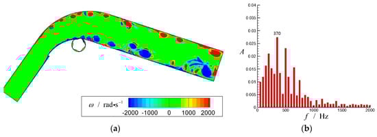 Numerical simulation of the diffuser without control (, , and ): (a) Vorticity () contour; (b) Velocity FFT of S2 ().