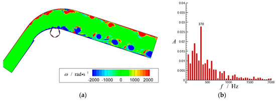 Figure 7 shows that without the control of traveling wave wall, the frequency of 370 Hz is superior to others and signifies the natural or dominant frequency along with other discrete prominent frequencies (secondary frequencies). After introducing the first effective control of ( and ), as shown in Figure 8, the amplitude of the dominant frequency is slightly enhanced by 1.1%, whereas many other secondary frequencies and clutters are restrained. This finding indicates that the natural frequency is enhanced and the flow field is orderly due to traveling wave wall control. The orderliness of the flow field can also be demonstrated from the vorticity contour of the flow field shown in Figure 7a and Figure 8a.
