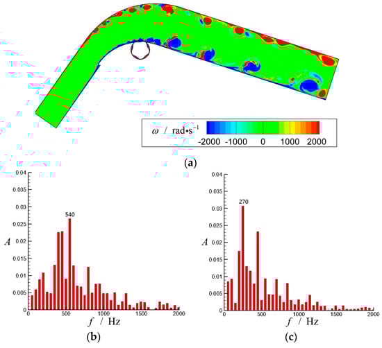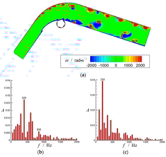 Numerical simulation of the diffuser with effective control (, , and ): (a) Vorticity () contour; (b) Velocity FFT of S1 (); (c) Velocity FFT of S2 ().