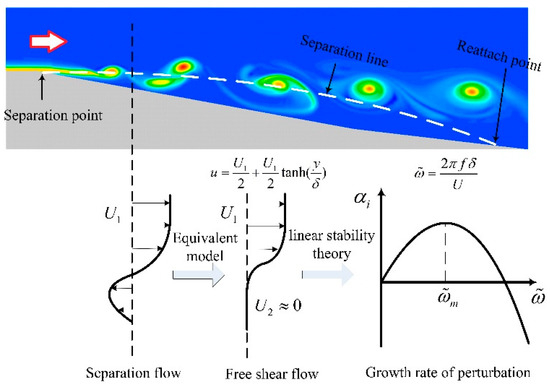 where indicates the thickness of the mixing layer. An approximately equivalent method is used to make an analogy between a free shear flow and a real flow separation by assuming that . This condition indicates that the phase velocity of vortex in the free shear flow equals [22], which fits the observation in real flow separations. When is used as the characteristic velocity , Equation (15) can be normalized as