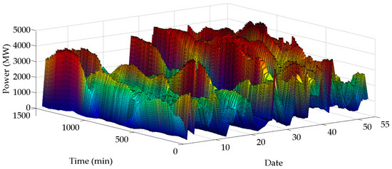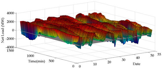 The variation of load data and wind power in a specific province from 3 March to 24 April 2017 are shown in Figure 1 and Figure 2, respectively. Based on those data, the electric loads are 12.5% scale-down to match the wind data for simulating a power grid operation condition with high-percentage wind power. After the scale-down, the trend of curve remains unchanged and the differences between wind power and electric loads are defined as net loads shown in Figure 3. As shown in Figure 3, the net loads are highly stochastic. No obvious regulation or trend can be found in these figures. If the power dispatch strategies remain the traditional ones, such highly stochastic net loads will result in large fluctuations on the power supply side, causing thermal generation power outputs to change frequently and decrease the efficiency and stability of the system.