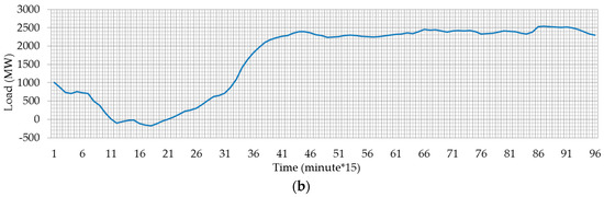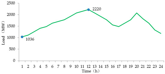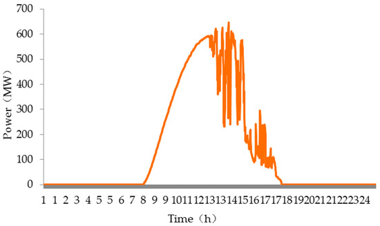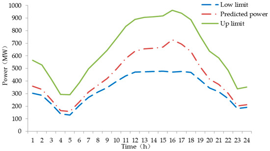 In order to demonstrate the effectiveness of the proposed power dispatch strategy, a 10-unit test system [47] is developed in this work. The unit data and cost coefficients are modified from [47,48] and listed in Table 2, where and are the maximum and minimum power limit of the units, respectively; a, b, and c are the coefficients of fuel cost functions for units; UR and DR are the ramp-up and ramp-down rate limits of the units, respectively; and are the up and down reserve cost coefficients, respectively; and are the up and down ramping cost coefficients, respectively. The load demand changing curve is shown in Figure 8, and the maximum load is 2220 MW. The installed capacity of pumped storage is 700 MW and the total available operational thermal power is 2358 MW. There are two wind farms with 500 MW installed capacity, respectively and the wind power penetration is 45%. The predicted wind power curves and the limit curves are shown in Figure 9. The installed capacity of photovoltaic station is 600 MW and the penetration is 27% as shown in Figure 10. The percentage of renewable energy in this model is 72% and the net load curve is shown in Figure 11.