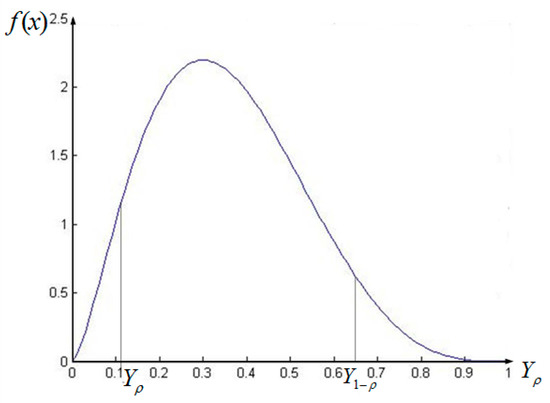 where Y is the random variable and is the fractile of . In Figure 6, the is the upper fractile and the is the lower fractile. is the density function of Y. Equations (24) and (25) can be transformed into Equations (34) and (35), corresponding to the type of Equation (33). When the is determined, the and can be received by calculating the inverse function through MATLAB. Thus, when the function (36) is satisfied, the constraint (34) is ensured. When the function (37) is satisfied, the constraint (35) is ensured.