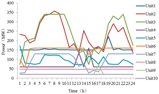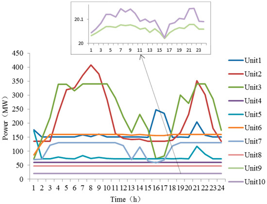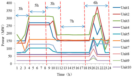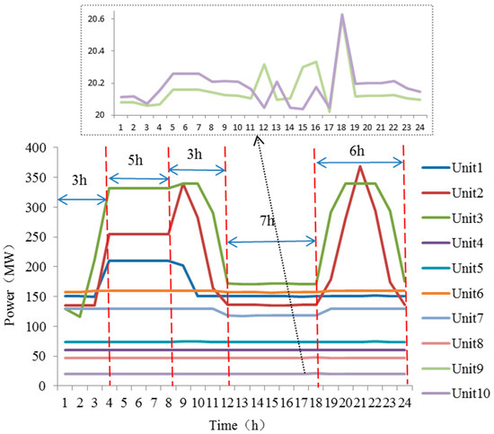 The power output of thermal generators in Case 1–Case 4 are shown in Figure 12, Figure 14, Figure 17 and Figure 19, respectively. The power outputs of Unit 8 and Unit 9 are similar thus the power output curve of Unit 9 is covered by the one of Unit 8. The optimization in Case 1 and Case 3 aim at minimizing the operational costs. Apart from the traditional operation constraints, the power output plan also pursues the maximum economy and responses to the uncertainty of renewable power energies. Through the net load tracing and SampEn calculation, the power outputs are as Figure 14 and Figure 19 shows. For the time periods with high complexity level net loads, the power outputs of thermal generators are limited according to SampEn. For example, as Table 3 shows, in the second time period (duration is 5 h) and the fourth time period (duration is 7 h), the SampEn are large. The thermal generators are limited and forced to operate continuously and stability. Therefore, the operation is kept stable and the generator efficiency is increased together with the ramping power in these time periods reduced.