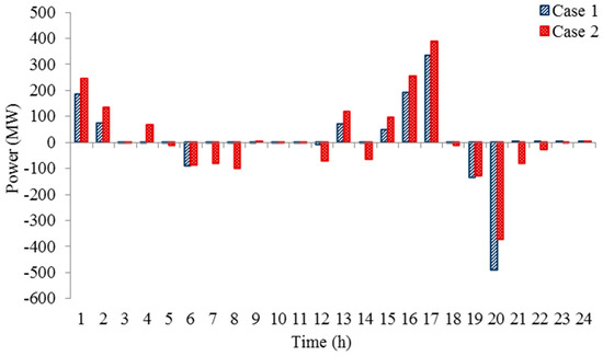 Power output comparisons of pumped storage in Case 1 and Case 2.