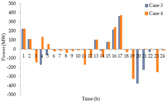 Power output comparisons of pumped storage in Case 3 and Case 4.