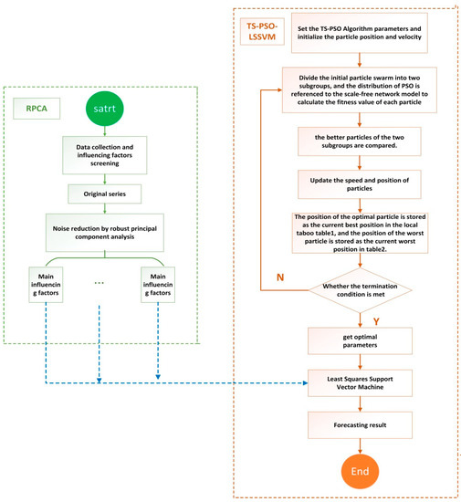 The forecasting process based on the RPCA-TS-PSO-LSSVM (Robust Principal Component Analysis and PSO-LSSVM Optimized by the Tabu Search) model.