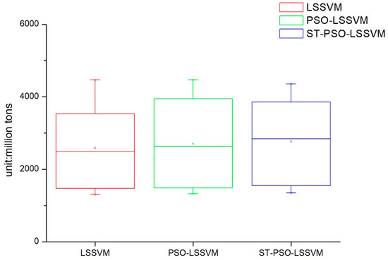 Through the analysis of the results in Figure 5 and Figure 6 and Table 5 and Table 6, we can find that the TS-PSO-LSSVM forecasting model has higher prediction accuracy from different directions. Based on relative error, the TS-PSO-LSSVM forecasting model not only maintains a relatively low relative error, but also has a small dispersion between relative errors, which shows a high degree of stability. From the perspective of mathematical statistics, we find that TS-PSO-LSSVM< PSO-LSSVM <LSSVM from the perspective of RMSE, which indicates the TS-PSO-LSSVM model in this article has the best performance from the perspective of degree of dispersion. The prediction results have higher robustness, which can also be proved by the boxplots shown in Figure 6; TS-PSO-LSSVM> PSO-LSSVM > LSSVM from the perspective of r2 indicator; TS-PSO-LSSVM < PSO-LSSVM < LSSVM from the perspective of MRE indicator, these two indicators jointly illustrate that the proposed TS-PSO-LSSVM model has higher prediction accuracy.