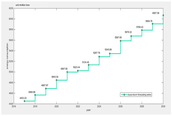 We applied GM (1, 1) (grey prediction theory) to forecast the GDP, population, industrial structure, energy consumption structure, and urbanization rate from 2017 to 2030, which was used as the input data of the TS-PSO-LSSVM forecasting model. Finally, we calculated the amount of energy consumption from 2017 to 2030, which is shown in Figure 7.