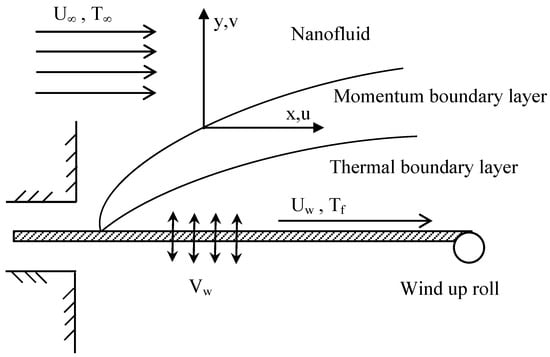 Consider a steady 2D laminar flow of an iron oxide nanoparticle (Fe3O4)–water nanofluid passing through a moveable plane in parallel to a free stream of constant velocity Uw in parallel with a constant free stream velocity U∞ with high fluid suction imposed on the surface. The flow pattern and physical coordinate system is demonstrated in Figure 1. In this coordinate frame, the x-axis extends in parallel to the surface, while the y-axis extends upwards, normal to the surface. The temperature at the plane surface is deemed to have a constant value Tf, which extends a heat transfer coefficient hf while the ambient temperature has a constant value T∞. The thermophysical properties of the nanofluid are given in Table 1. In addition, both the base fluid (i.e., water) and the nanoparticles are in thermal equilibrium, and no slip occurs between them. With the above assumptions, the simplifying governing equations of the problem are