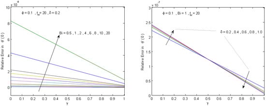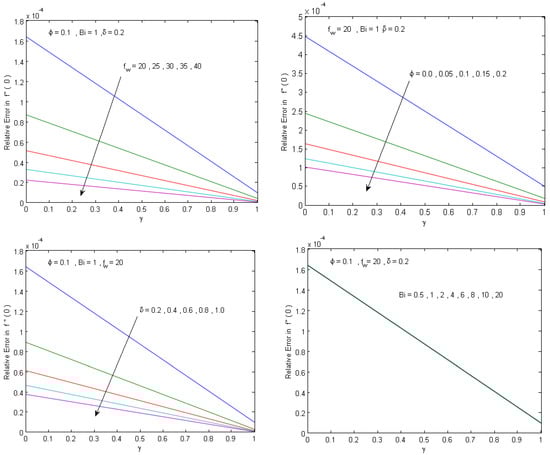 In order to assess the accuracy of the proposed analytical solution, a comparison is presented with the numerical solution generated using the built-in MATLAB boundary value solver, bvp4c, which is an adaptive Lobatto quadrature scheme []. To assure that the bvp4c numerical solution can be considered as a good reference solution in our computations, the bvp4c solver is set with (Abstol = , Reltol = ). The analytical solution is evaluated at the bvp4c grid points for different values of the governing physical parameters, and the maximum absolute and relative errors are presented in Figure 2, Figure 3, Figure 4 and Figure 5. Figure 2 and Figure 3 show that the achieved analytical solution has maximum absolute errors within 2.2 × 10−6 and 3.9 × 10−4 in approximating the temperature and velocity solutions, respectively. Figure 4 and Figure 5 show that the maximum relative error is within and in approximating the Nusselt number and skin friction parameter, respectively. The results confirm that a good agreement between analytical and numerical solutions is achieved. Moreover, Figure 2, Figure 3, Figure 4 and Figure 5 show that the numerical data agree with the theoretical results (Theorems 1 and 2), which confirms the validity of the analytical approach and reveals that the method is sufficiently accurate for engineering applications.