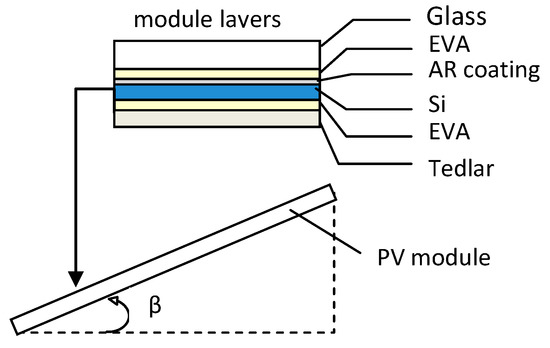 A time dependent temperature profile is developed in a PV cell when under solar irradiance, IT, [8,30]. The latter is the main factor contributing to the development of the temperature profile in which the ambient temperature Ta and the wind speed play a role too. This profile has a straight relationship with IT at low Concentration Ratio, C, conditions, with C < 4, where C = IT/103 W/m2, and a strong dependence on the wind speed, vw; that is, Tc(t; IT, vw). Tc(t) depends, also, on the cell structure and the material composition of its layers. Figure 1 shows a section of a PV cell with its characteristic layers which govern the heat conduction causing an effect on the time constant, τ, of the temperature profiles. Tc(t) or Tpv(t), either the PV module is heated or cooled due to changes in the environmental conditions, is described through an exponential term, exp(−t/τ), as discussed in Section 2 and Section 3.