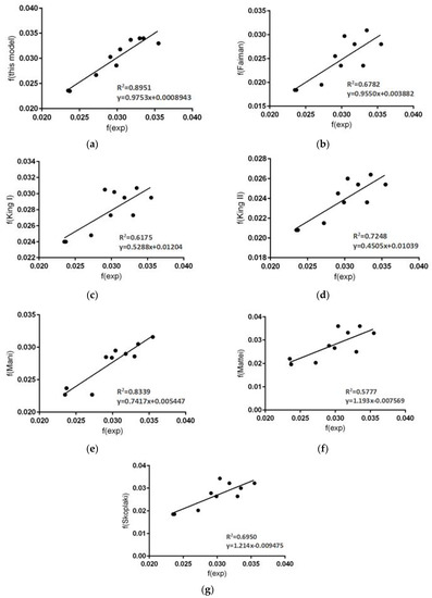 Results from a regression analysis of predicted f values versus the experimentally determined f values where f is predicted by (a) the proposed model, (b) model [2], (c) model [1], (d) model [7], (e) model [5], (f) model [4], and (g) model [3].