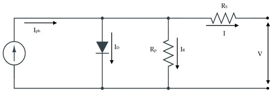 The photo current occurs from sunlight, which causes the solar PV cell to generate the electric charge. This charge will flow through the electrical load, and is directly proportional to the solar radiation. The equivalent circuit of the solar PV module is shown in Figure 1. The relationship of the output current and the output voltage from a solar PV module is presented in Equation (1) [24].