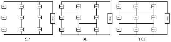The PV module configurations can be classified into three standard configurations: series-parallel (SP), bridge-linked (BL), and total cross-tied (TCT). An example of each configuration is shown in Figure 2 [11,13].