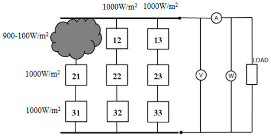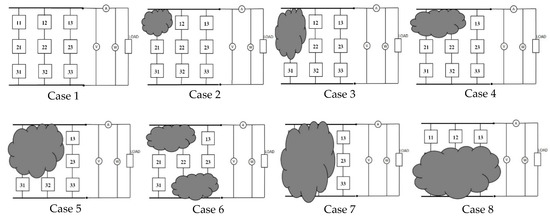 Generally, shading at a solar PV module happens partially along the module. The occurrence of shading could decrease the output power; thus, we try to minimize the effect of shading by the reconfiguration of modules. However, shading situations occur instantaneously and cannot represent the normal behavior of the module. In this study, the shading patterns are classified into eight patterns: no shade (0% shaded), 1 of 9 PV panels (11% shaded), 2 of 9 PV panels (22% shaded), 4 of 9 PV panels (44% shaded), and 6 of 9 PV panels (66% shaded) as shown in Figure 3. For the simulation of a referenced case, the solar radiation is set to 1000 W/m2 and the temperature of the PV is set to be constant at 40 °C. In the cases of partial shading, the solar radiation drops from 900 W/m2 to 100 W/m2 at the temperature of 40 °C as shown in Figure 4. The solar radiation level that gives a 5% or more difference in output power for each shading case will be considered as the point to start reconfiguring the solar PV array.