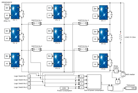 With respect to dust or shade, these cause a reduction in the current and voltage of the affected panel. The panel that provides the minimum value of power will behave itself as an electrical load that consumes electricity from other panels. This will cause a reduction in the total power output. In previous studies, numerous mathematical models were developed to study the effects of the factors affecting the output power of solar PV. The obtained results from mathematical models were compared with those from simulation using a PV equivalent circuit [4,5]. The impact of partial shading and the dynamic efficiency of solar PV were studied [6,7,8,9,10,11,12]. The result found that it was necessary to automatically reconfigure the solar PV array when partial shading occurs in order to increase the output power. Consequently, many studies have aimed to solve this problem by using methods to reconfigure the solar PV array. Solar PV array reconfiguration is a well-known and popular method to increase the power output and efficiency of electricity generation. The conventional configuration type of a solar PV array can be classified into three types: series-parallel (SP), bridge-linked (BL), and total cross-tied (TCT). For SP, the configuration of this type is a combination of a series and a parallel connection of each panel. For BL, the connection of each panel is nearly the same as in the SP configuration, but the connections of some rows between each string will be added. Lastly, for TCT, the connection of each panel is nearly the same as in BL, but there are connections for all rows between each string. TCT is the most suitable configuration for reducing operation loss when a PV module is shaded [13]. In 2009, the impact of shade in the series configuration of a solar photovoltaic array (SPVA) was studied by simulation in MATLAB with the MPPT method. The results found that a shaded solar PV module will behave as an electrical load and can be damaged by the accumulated heat. Bypass diodes could protect the shaded solar PV module from the damage. When considering the whole solar PV system, the shade caused multiple peaks that caused MPPT to not operate normally, and the solar PV modules were unable to operate at their maximum output power [14].