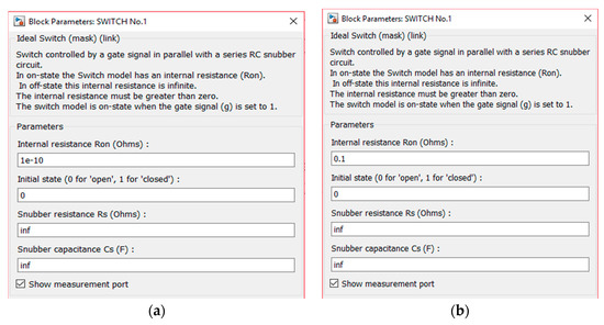 Figure 7a shows the setting for the ideal switch, which has no voltage drop when the switch is on. This condition is lossless and the results are presented in Section 3.1. In Figure 7b, 100 mΩ of contact resistance is set, which causes loss according to the following equation: