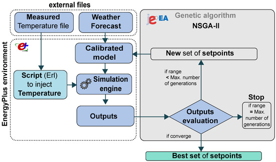 - Simulation environment. As explained in Section 1, building energy models play an important role in the process of obtaining good MPC solutions. The optimization process evaluates the outputs of the model in each iteration, so the more accurate the results, the better the evaluation. EnergyPlus software [11] is used to perform the simulations due to the proven quality of its results, which is perhaps why it is one of the most commonly used applications to perform detailed simulations [46]. The methodology starts with the use of calibrated energy models to simulate the behavior of the building. The process to obtain them is described in our latest research on this topic [47,48,49,50].Once the model has been calibrated, it is necessary to reproduce in each simulation all of the aspects that influence the energy model so that the thermal dynamics of the building are not compromised. That is the reason why the process needs two external files, as can be seen in Figure 1: the weather forecast and the file with the measured temperatures of the building’s thermal zones. As Ascione et al. [24] highlight, the accuracy and reliability of weather forecasts is one of the main critical issues for MPC optimizations since inaccuracies greatly affect the simulation results. Secondly, the measured temperature file is needed to solve the EnergyPlus initialization issue described by many authors [17,19,22,51]. The software performs several warm-ups prior to the simulation in order to establish a temperature convergence in the thermal zone. These warm-ups can produce distortions in the results of MPC because, for a specific time horizon, all the simulations should be initialized with the same values. Thanks to a specific script developed in ERL (EnergyPlus Runtime Language), it is possible to inject the measured temperatures, ensuring that the model has the thermal dynamics captured before MPC process starts. Thus, the behavior of the calibrated detailed model is the most accurate possible.Once the model is defined, the simulation gives us the objectives (outputs) that the optimization algorithm needs to evaluate the proposed solution. In this case, different temperature set-points (solutions) are evaluated through energy consumption minimization. These solutions could be used, for instance, in a real building scenario for day-ahead approaches. The choice of this cost function is explained in Section 2.2, but others could have been chosen (predicted mean vote (PMV), use of renewable energy, evaluation of energy and demand cost, and so on).Finally, it is important to highlight that detailed energy models have computational time as a major disadvantage. This is a critical issue due to the fact that the optimization process needs to run a high number of simulations in each iteration. To solve this issue, it is necessary to act on two fronts, improving hardware capabilities and correcting and adjusting the simulation file. The former is due to features such as clock speed and the number of computer cores are very important since they affect the simulation time and the number of parallel jobs that can be performed, respectively. The latter can result from incorrect run periods, unused elements (such as schedules, materials, constructions and loads), modeling inefficiencies (including a high number of shading surfaces and useless computed outputs), among others, stacked against the simulation time. All these key points should be checked before running the optimization process.